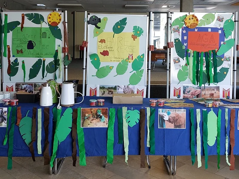 Zu der Ausstellung passend, stellte die Klasse 5c Elefantenkekse her. Dabei wählten die Schülerinnen und Schüler nachhaltige Produkte aus. Der faire Kakao für die Augen wurde sogar in einem Discounter besorgt.