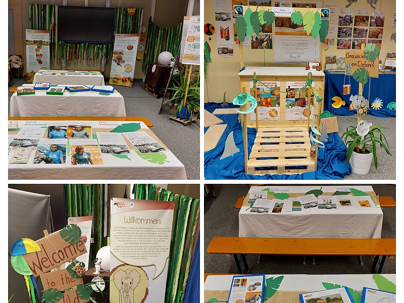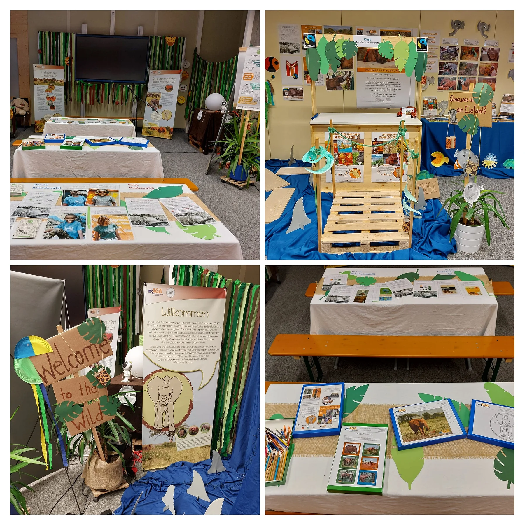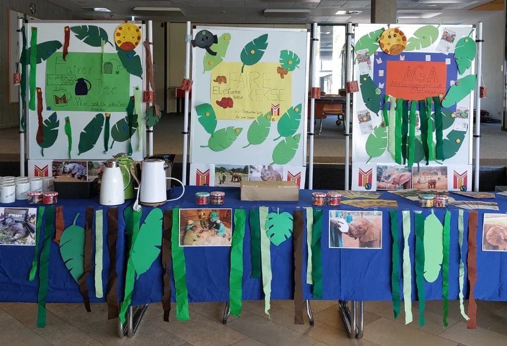 Unter der Leitung von unserer Schulsozialarbeiterin wurde die Ausstellung „Fairer Handel und Artenschutz“, die über das ganze Schuljahr 2024/2025 hinweg entstand, eröffnet. Dabei wird am Beispiel eines Elefantenwaisenkindes „Kerrio“ die Notwendigkeit eines nachhaltigen und fairen Handelns verdeutlicht. Durch den fairen Handel zwischen den reicheren und den ärmeren Ländern werden die Naturräume und somit auch bedrohte Tierarten beschützt. Auch die Ausstellung selbst wurde besonders nachhaltig und kostengünstig erstellt. Neben Leihgaben von Plakaten der Aktionsgemeinschaft Artenschutz, Büchern und vorhandenen Möbeln (Kiosk, Palettenmöbel) bastelten die Schülerinnen und Schüler nur aus Papier und Farben verschiedene Tiere, Blätter, Lianen und Wasser. Viele kleine Details in allen Ecken sorgten dafür, dass der Mehrzweckraum sich eine andere Welt verwandelte, die nur über ein Haifischbecken erreicht werden konnte. Schülerteams erzählten, zeigten imposante Videos, steuerten die Lichteffekte und Nebelmaschine selbstständig. So vermittelten sie, wie wichtig unser Handeln für den Schutz bedrohter Tierarten ist. Im Anschluss an die Vorstellung konnten dann die Besucher ein sehr anspruchsvolles Quiz lösen, auf den Palettenmöbeln in Sachbüchern schmökern, ein Elefantenmemory spielen, ein Elefantenpuzzle machen, Elefanten ausmalen oder auch fair gehandelte Produkte am Schulkiosk erwerben. Die Ausstellung stand für die Klassen 5 bis 7 etwa drei Wochen zur Verfügung. Das Sprecherteam wurde mit einheitlichen fairen T-Shirts ausgestattet. Die Klasse 5c designte die Shirts, recherchierte nach fairen Produkten im Internet und beplottete dann die Kleidung selbst.