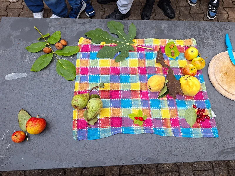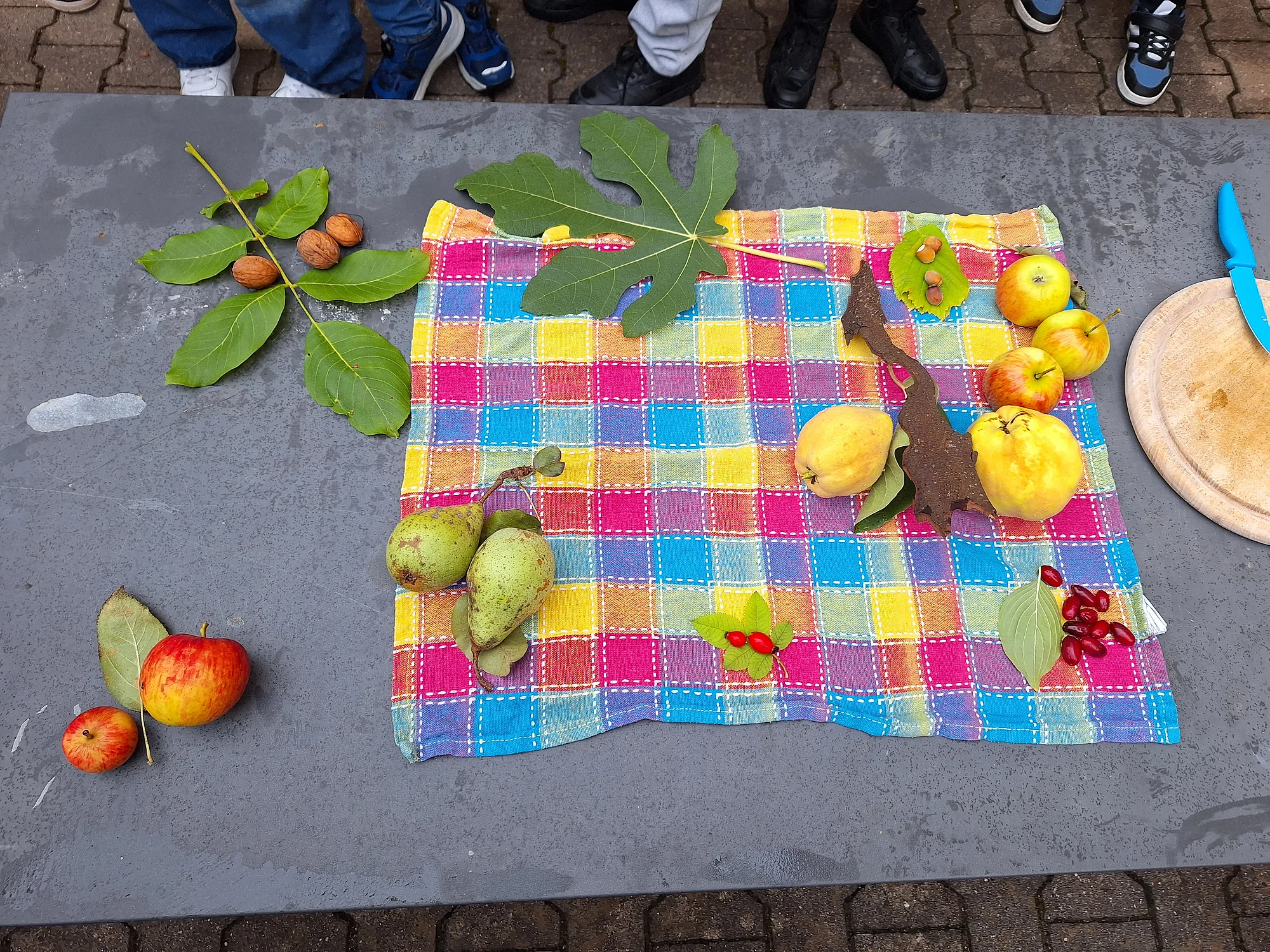 Unter fachkundiger Anleitung erfuhren die Schülerinnen und Schüler viel über einheimische Früchte. Mit großem Eifer sammelten sie Äpfel, Birnen, Quitten, Feigen und andere Obstsorten und stellten diese anschließend ihren Mitschülerinnen und Mitschülern vor. Dabei beschrieben sie nicht nur die Früchte selbst, sondern auch die Blätter und den Stamm der Bäume, an denen sie gewachsen waren.