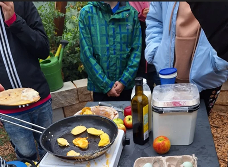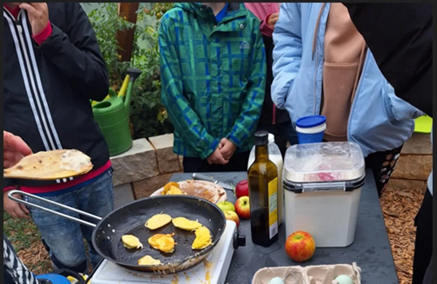 Natürlich durfte das Probieren nicht fehlen: Nach der gemeinsamen Erkundung genoss die Gruppe die gesammelten Früchte. Ein Höhepunkt des Vormittags war das Backen frischer Apfelküchle. Mit tatkräftiger Unterstützung der Kinder entstanden köstliche Leckereien, die noch warm verspeist wurden.