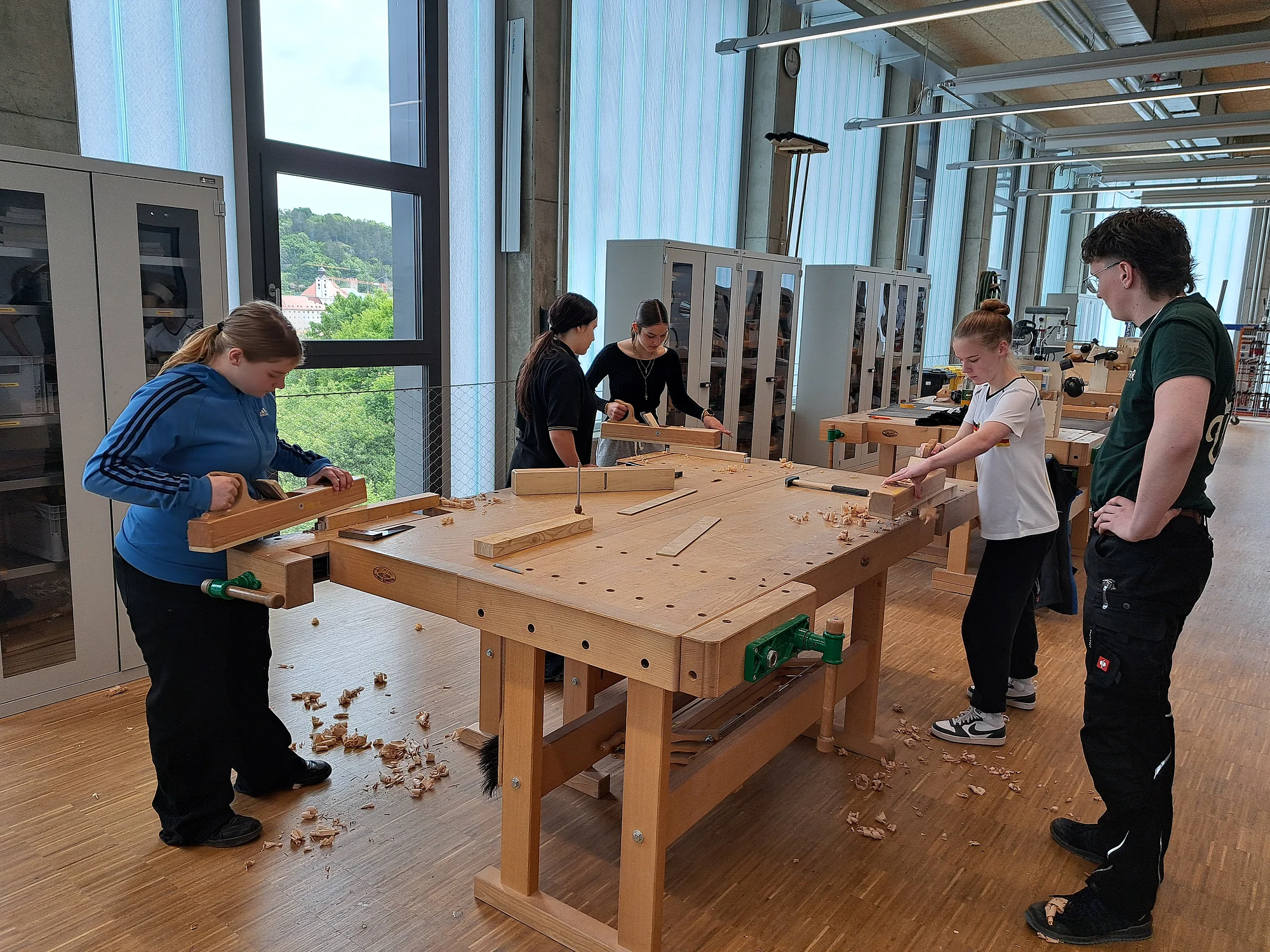 Die 8. Klasse besuchte im Rahmen des Technik-Unterrichts mit Herrn Riedler die Schreinerabteilung der Berufsschule Eichstätt. Dabei konnten sie den Lehrlingen beim Herstellen eines Tabletts über die Schulter schauen. Die Handhabung der Holzbearbeitungsmaschienen wurde praxisorientiert von den Ausbildern und Azubis vorgestellt. Am Schluss durften die Mittelschüler noch selbst Hand anlegen und die zugesägten Kanthölzer mit der Raubank abrichten.