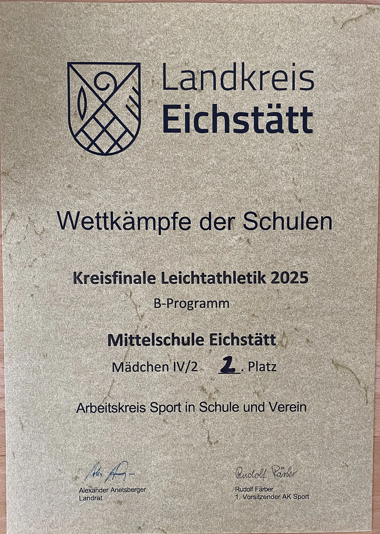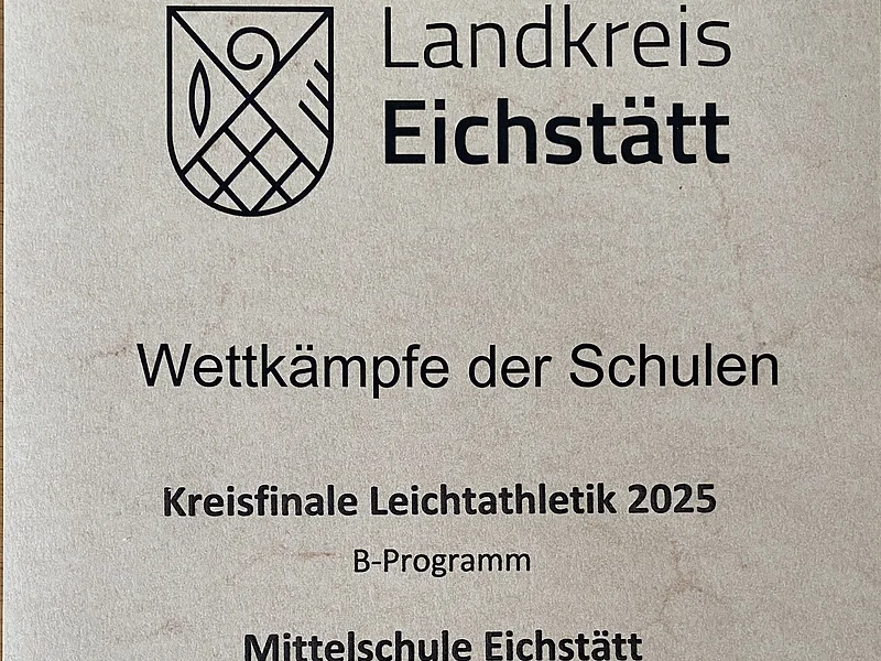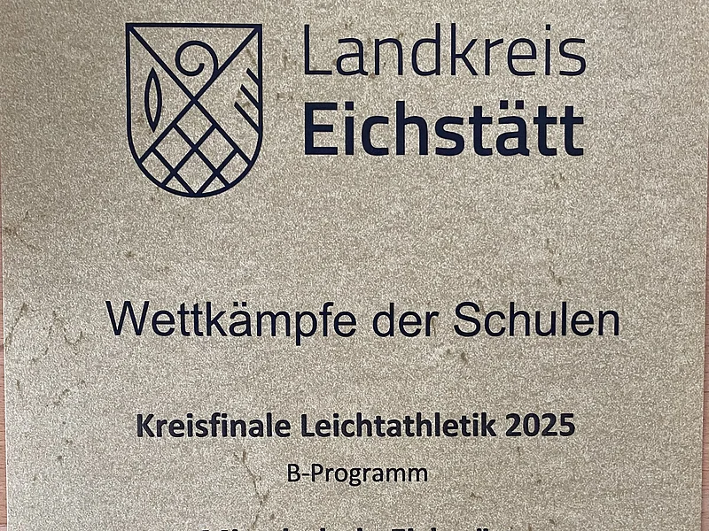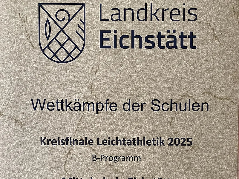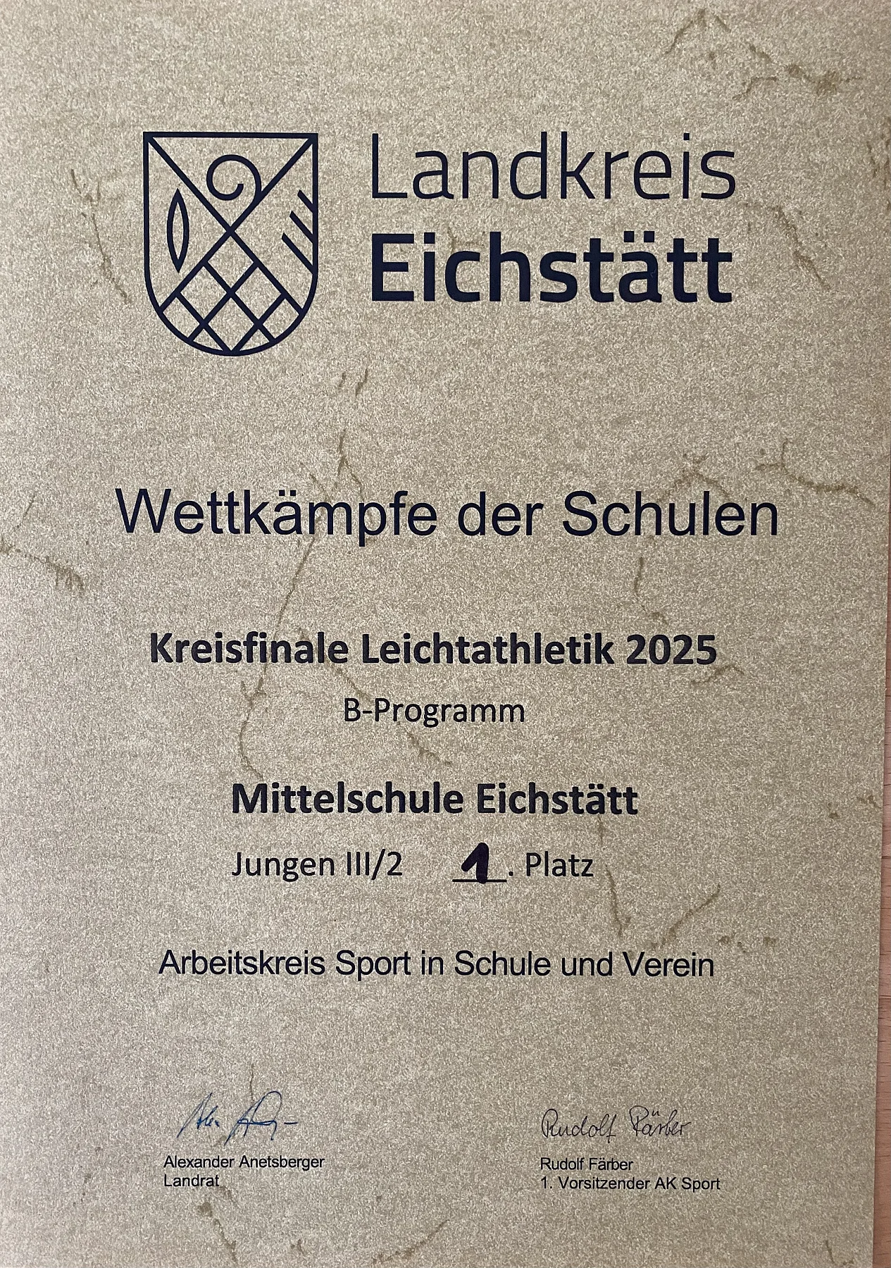 Wir gratulieren unseren Teilnehmern beim Leichtathletik-Landkreisfinale 2025! Drei Mannschaften erreichten den zweiten, eine Mannschaft sogar den ersten Platz! Zusammen mit vielen anderen Schulen des Landkreises lieferten sie sich spannende Wettkämpfe in den Bereichen Sprint, Weitwurf und Weitsprung. Zwei der Mannschaften nahmen zusätzlich noch am Staffelwettbewerb teil. Stattgefunden hatte der Wettbewerb auf dem Sportgelände der Bereitschaftspolizei Eichstätt.