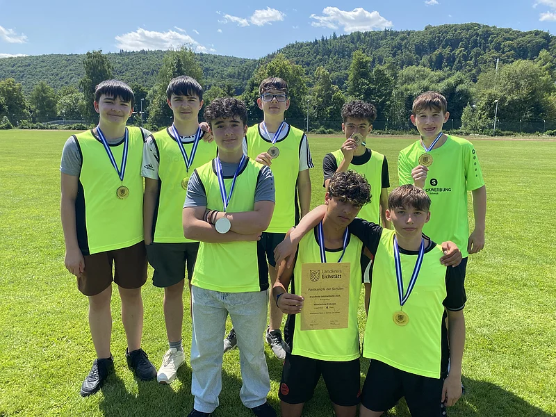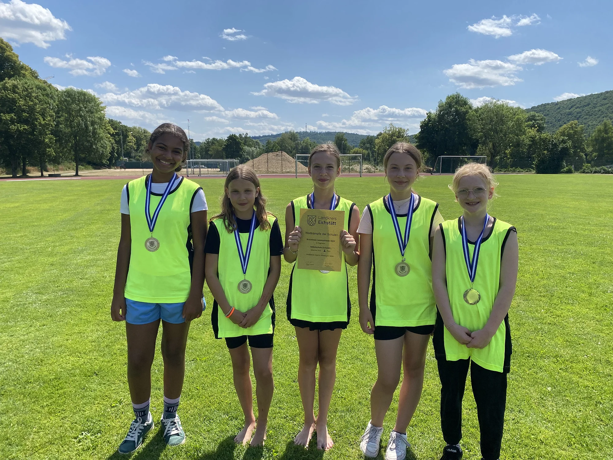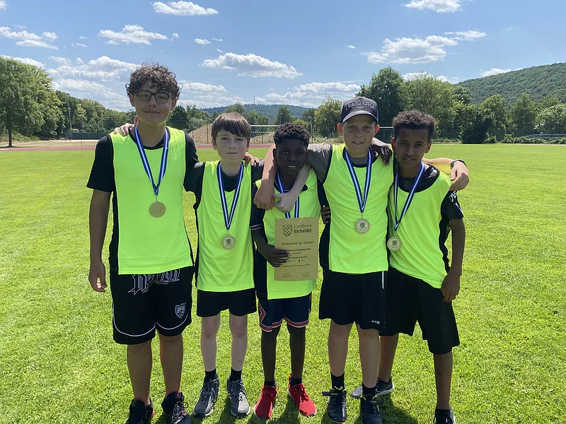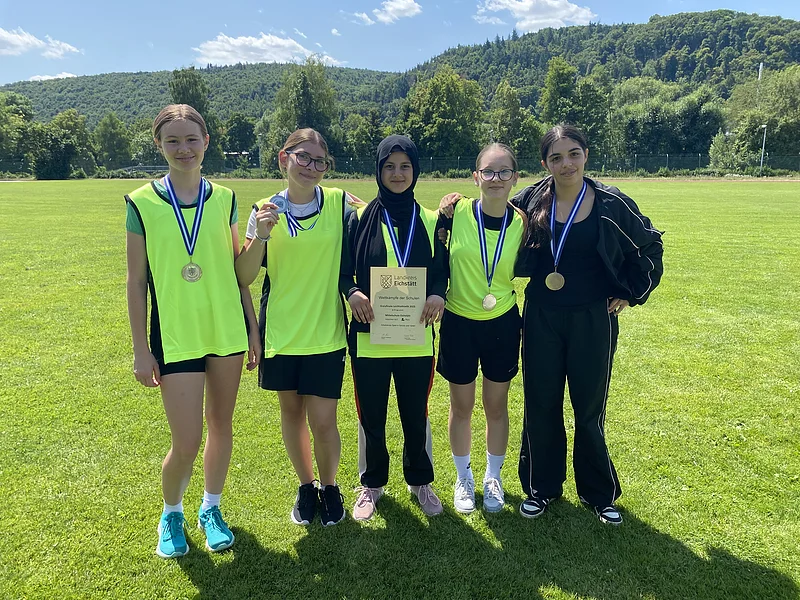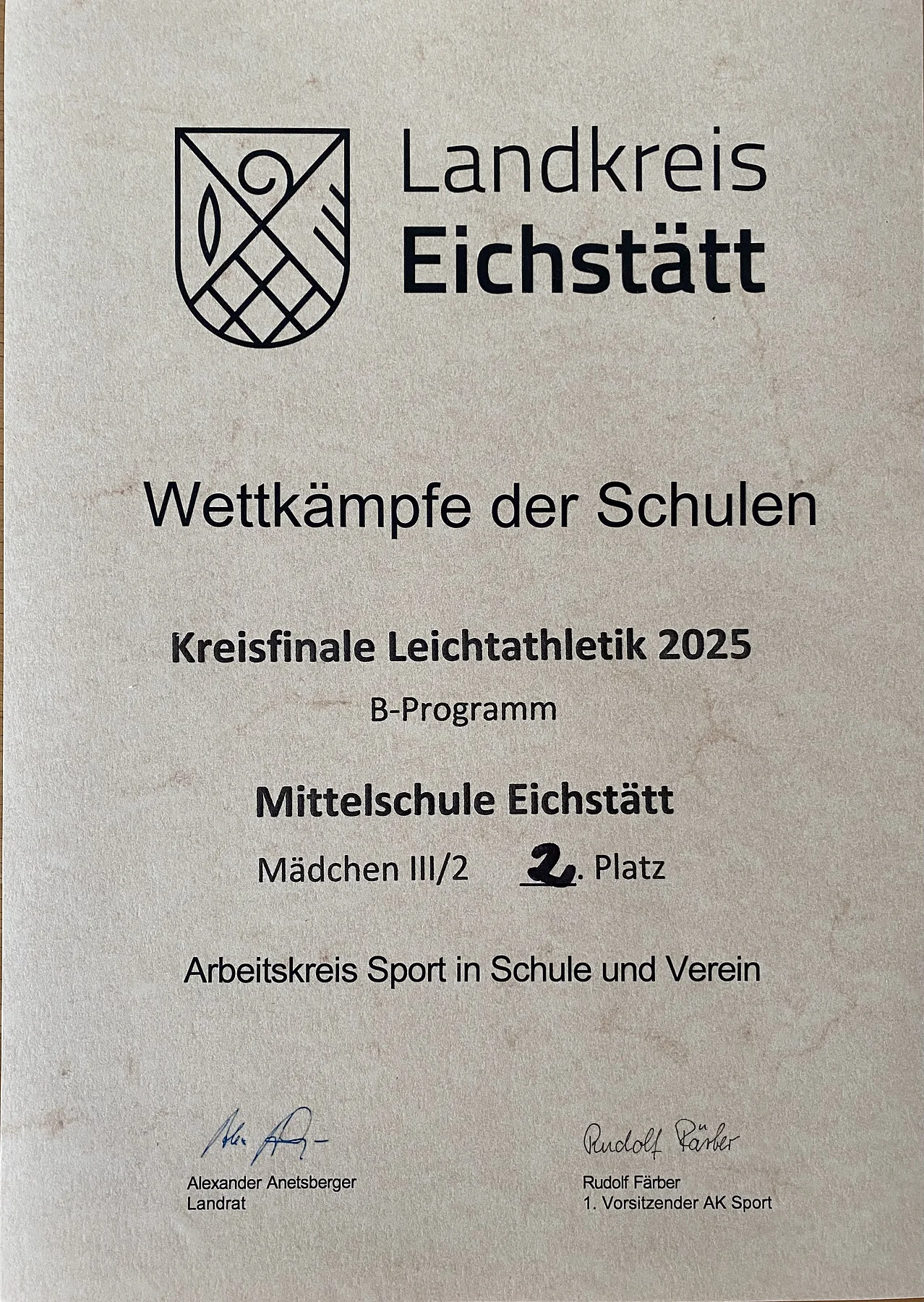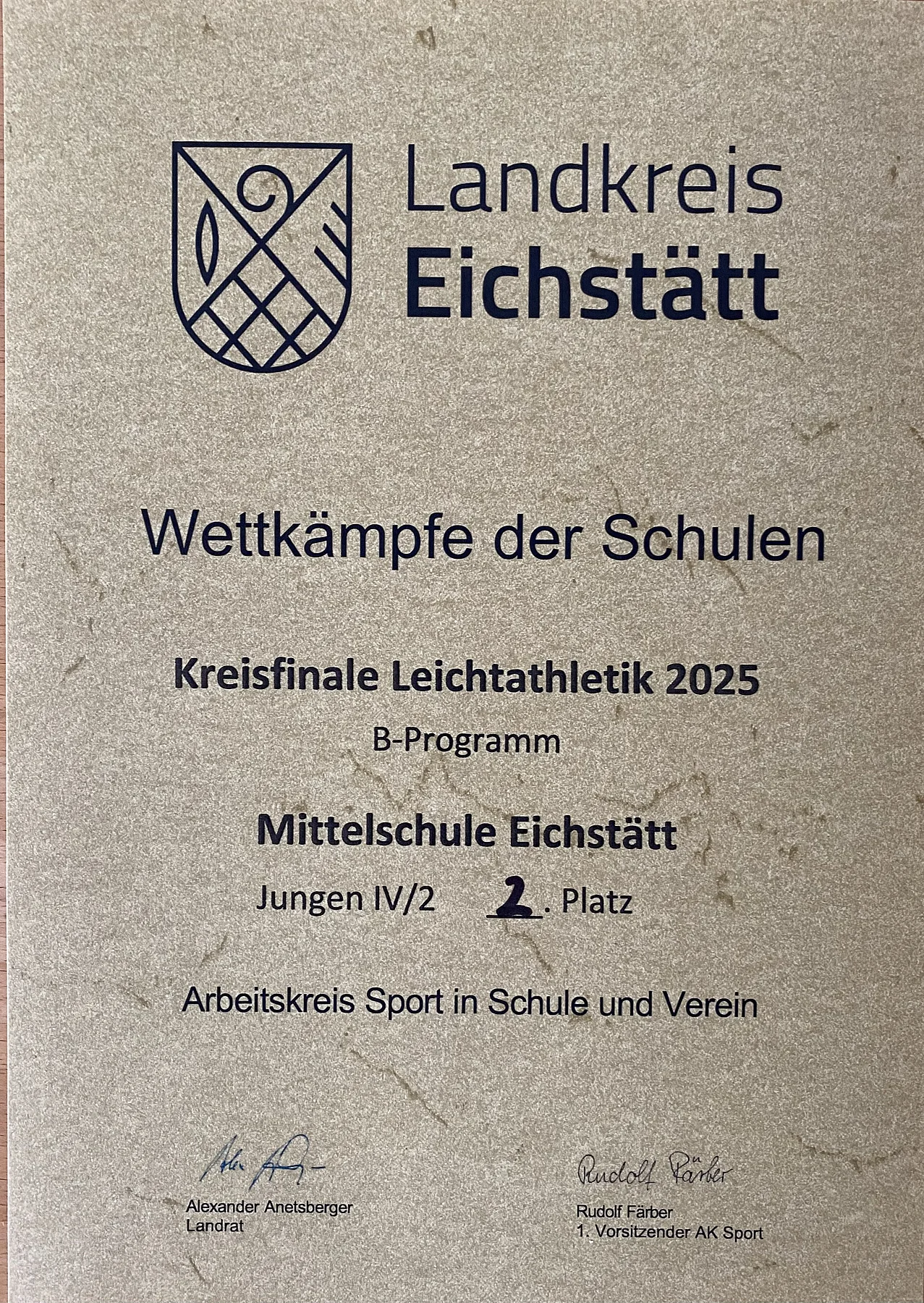Wir gratulieren unseren Teilnehmern beim Leichtathletik-Landkreisfinale 2025! Drei Mannschaften erreichten den zweiten, eine Mannschaft sogar den ersten Platz! Zusammen mit vielen anderen Schulen des Landkreises lieferten sie sich spannende Wettkämpfe in den Bereichen Sprint, Weitwurf und Weitsprung. Zwei der Mannschaften nahmen zusätzlich noch am Staffelwettbewerb teil. Stattgefunden hatte der Wettbewerb auf dem Sportgelände der Bereitschaftspolizei Eichstätt.