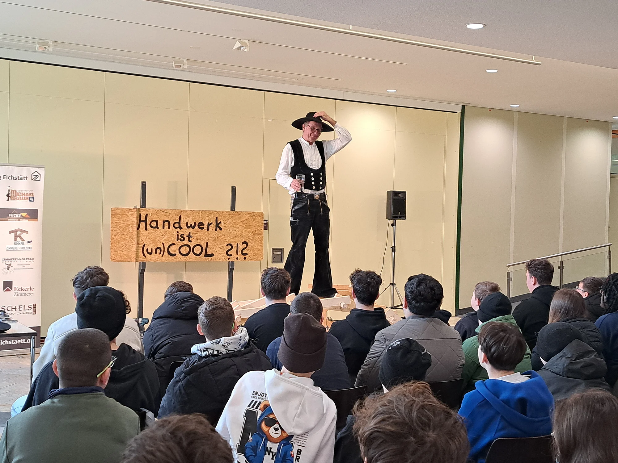 Zu einem Zimmerertheater lud die Mittelschule Eichstätt Herrn Betz an die Schottenau ein. Rund 200 Schüler aus 4 Schulen (Knabenrealschule Rebdorf, Schule an der Altmühl, Mittelschule Eichstätt und die Schule des Kinderdorfs Marienstein) folgten dem spannenden Vortrag. Herr Betz erzählte in Theaterform, wie er als fertiger Abiturient über Umweg und einem abgeschlossenes Architekturstudium zum Zimmererhandwerk fand. Das Handwerk sei anstrengend, so Betz - aber genau darin liege oft der Schlüssel zur Zufriedenheit. In der abschließenden Fragerunde unterstützten die Zimmerermeister Michael Kraus und Michael Templer als Vertreter der Zimmererinnung Eichstätt Herrn Betz.